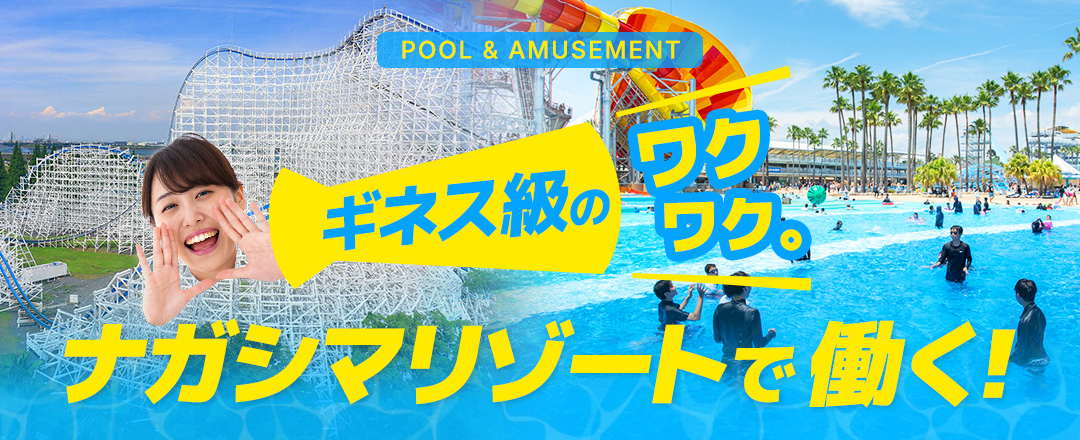 プールだけじゃなく、西日本最大級の遊園地「ナガシマスパーランド」でのお仕事。ウォータースライダーやキッズ向けアトラクションなどの接客補助。とにかく楽しみたい方におススメ!!